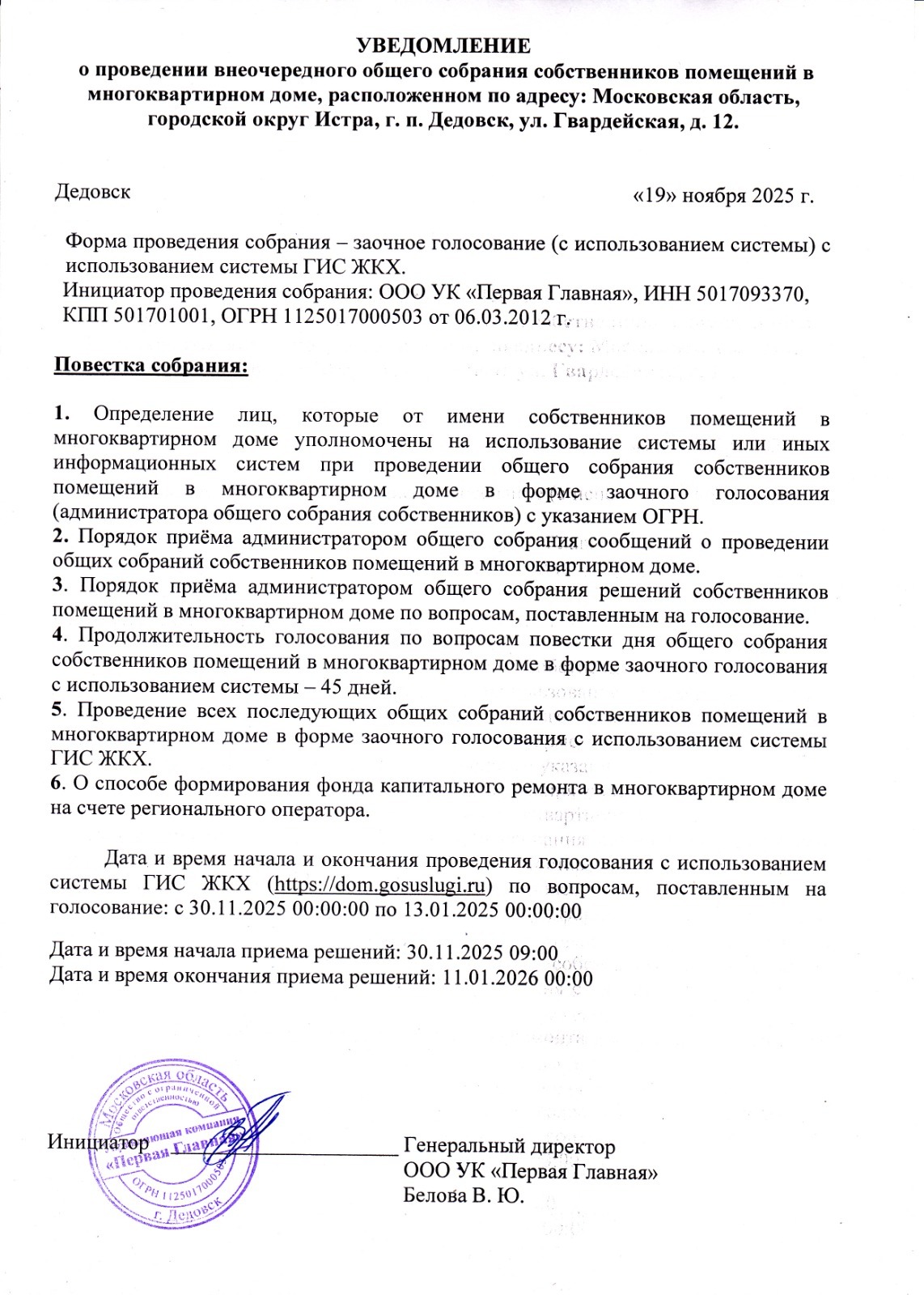 о проведении внеочередного общего собрания собственников помещений в многоквартирном доме, расположенном по адресу: Московская область, городской округ Истра, г. п. Дедовск, ул. Гвардейская, д. 12.